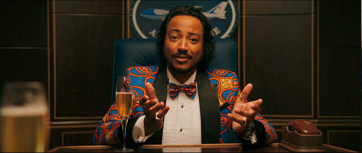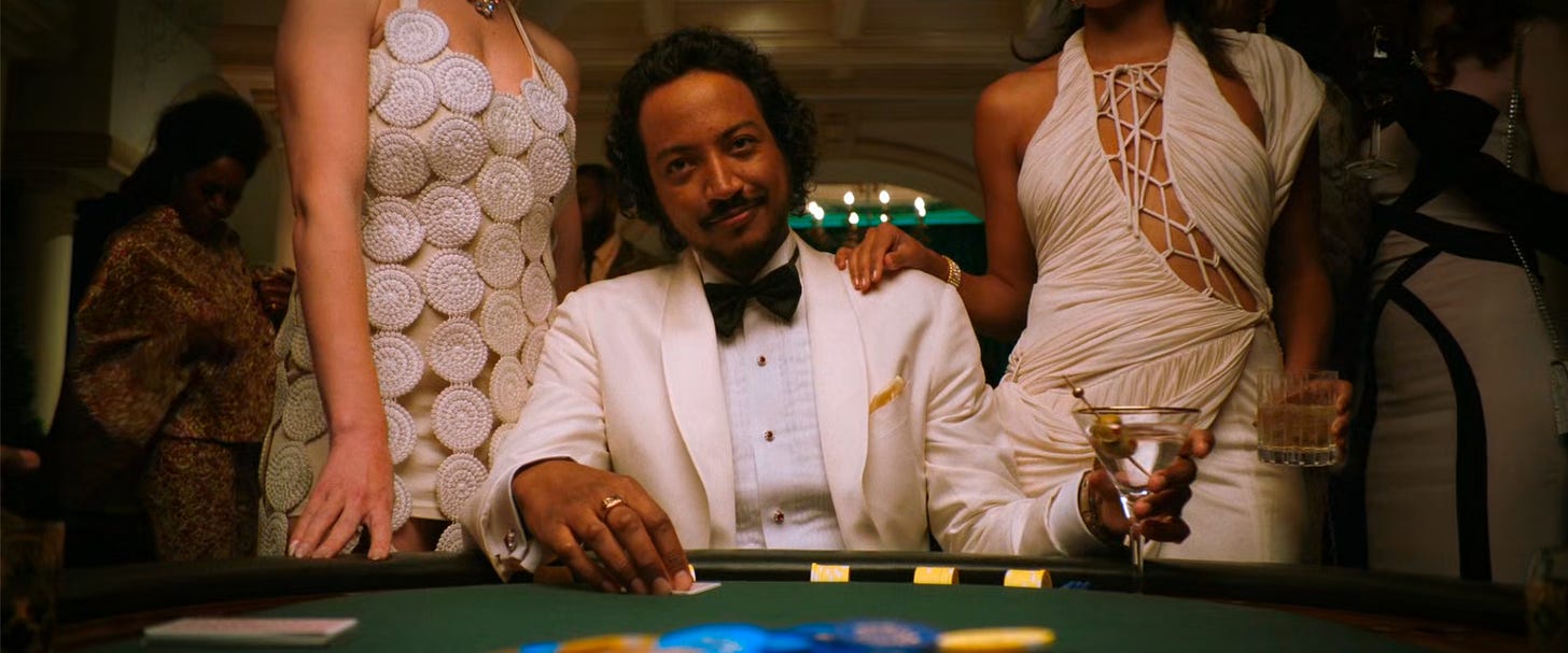 The gambling scene looks straight out of Thunderball (1965), Sean Connery’s fourth James Bond movie, but on closer inspection appears to be an aggregate of casino scenes from several films. Diabaté is Bond (just after the title card we see the green-dress waitress shake his martini—no stirring). He plays poker against a few odd characters, including apparently Jeffrey Lebowski, and a stereotypical bond villain who wears an eyepatch like Largo from Thunderball but has hair. The actor, François Guétary, is listed in the credits as “Blofinger,” an amalgam of Blofeld (the heavy in several bond films) and Goldfinger (played famously (famously played…?) by Gert Fröbe).