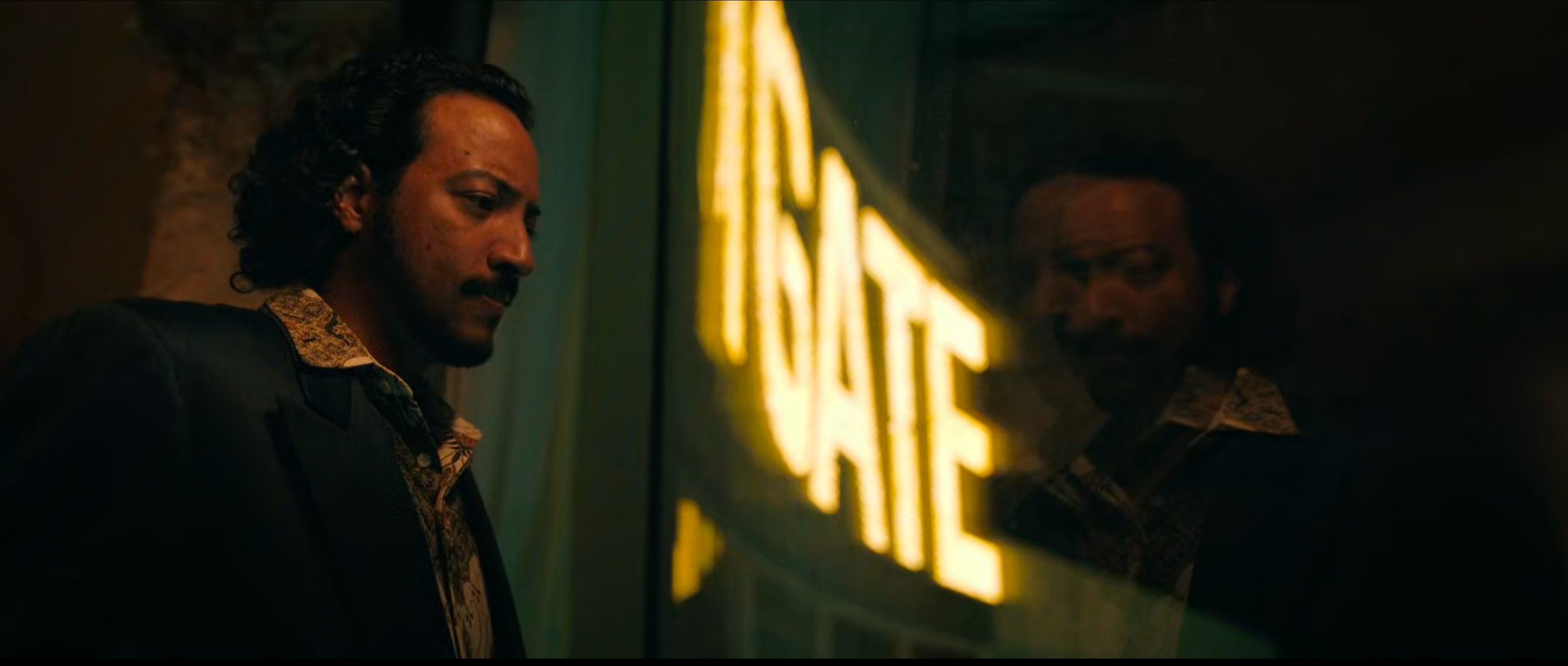 Any time we see a character looking in the mirror—especially a window at night (the original black mirror)—they’re having a self-reflective moment. A literal reflection is always a visual correlative for a metaphorical reflection.