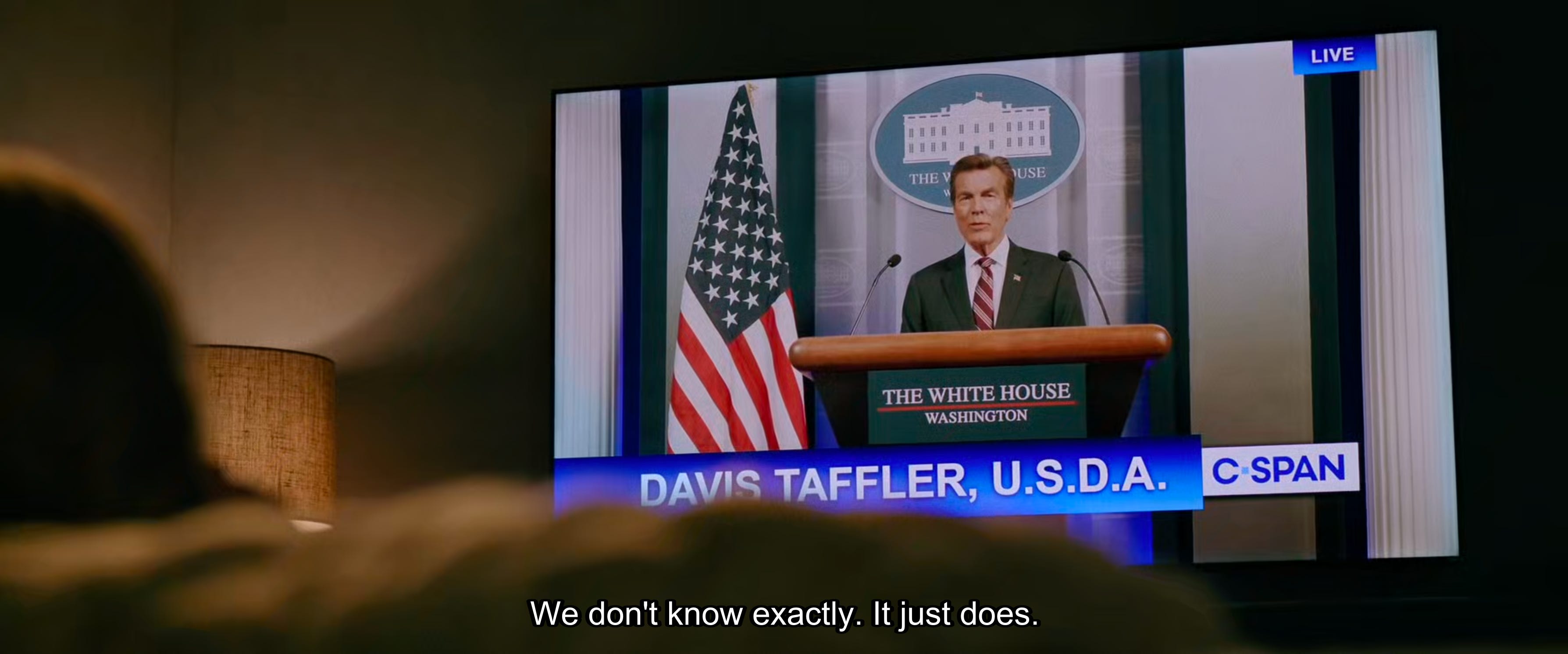 Also, we should probably keep an eye on many of Taffler’s lines, including “That individual [the president] passed away this evening, along with quite a few senior members of the United States Government…”